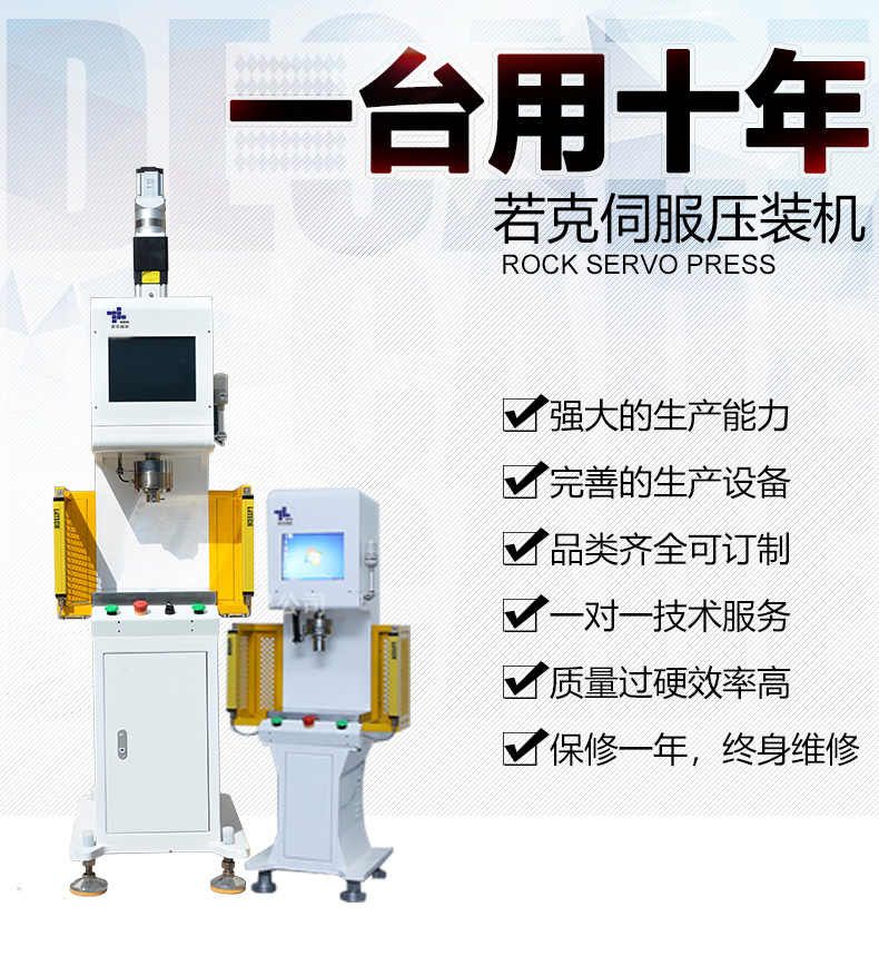 若克压装系统ROCK PRESS FITTING SYSTEM由主机、控制电脑、机架(选配)组成,结构紧凑,充满力的美感,在体验科技带来的便利之际,令压装工作成为轻松加愉快的享受。 主机:机型结构分为四柱、C型机(建议2T机型以上选用四柱机,更加稳定,行程更长。) 若克伺服压机设备,压机设备特点: 1:主机结构以电动缸驱动为主,电缸以滚珠、滚柱丝杆传动为首选,经济适用型可采用T型丝杆,客户可根据自身精度需求定制,若克压装系统ROCK PRESS FITTING SYSTEM软件保证全过程准确控制压装力、停止位置、压装速度和保压时间等参数,达到全过程数控管理。 与传统压力机相比,伺服压力机的特征如下: 一、提高生产率: 行程长度可设定为生产必要的最小值,可维持与加工内容相适合的成形速度,现有若克主机通过千锤百炼的实验结论,合理定义为0.5T; 2.0T; 5T;10T四款机型,压力涵盖0.1-10T范围,满足精密压装组件的基本需求,如需定制,可做非标选型。 二、节能环保:专用控制电脑采用自主研发FPGA控制板卡、软件,控制板卡与软件完美结合,有别与传统PLC控制,控制精度、准度上升至新的数量级,省电50%-80%. 三、安全精密:每台机器均安装红外线安全光栅,有效保护操作人员,伺服智能专利控制匹配最佳的压装方案,确保机器重复定位精度可达0.01mm,压力误差±1%。 四、故障率低:伺服智能专利工控系统,现有若克主机通过千锤百炼的实验结论,故障率低生产效率稳定高效,机器设有故障自动报警及一键复位功能,数据实时反馈。 五、稳定耐用:机架采用整机框架结构,机身采用整体铸造,内置传感器,滑块采用精密导轨导向运行,耐震及抗侧压力强,整机稳定,精密耐用,适用于冲裁、成型、挤压、冲孔切断、组装、打字压印等多种工艺用途。 六、维修方便:整机按不同功能模式、设计成模块结构,拆装简便,一般故障可直接通过触摸屏观看,维修简易。 现代自动化工业飞速发展,伺服压机设备,压机设备作为一个新型高效节能环保产品,低噪音,环境好,低维护成本,优异的控制性和稳定性,得到越来越多的企业青睐和认可。尤其是在当今重视能源和环境的前提下,应用伺服压力机取代液压和气动压装机是未来发展的趋势。