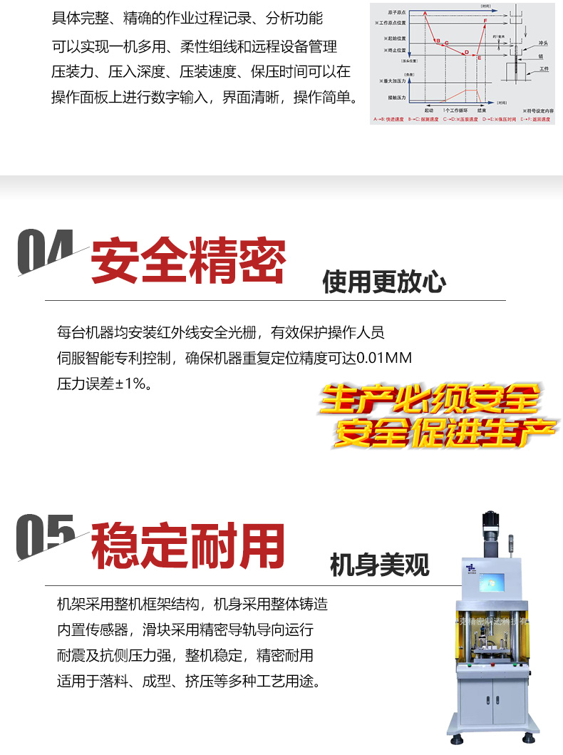 三、安全精密:每台机器均安装红外线安全光栅,有效保护操作人员,伺服智能专利控制匹配最佳的压装方案,确保机器重复定位精度可达0.01mm,压力误差±1%。