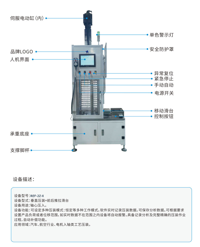 1:主机结构以电动缸驱动为主,电缸以滚珠、滚柱丝杆传动为首选,经济适用型可采用T型丝杆,客户可根据自身精度需求定制,若克压装系统ROCK PRESS FITTING SYSTEM软件保证全过程准确控制压装力、停止位置、压装速度和保压时间等参数,达到全过程数控管理。