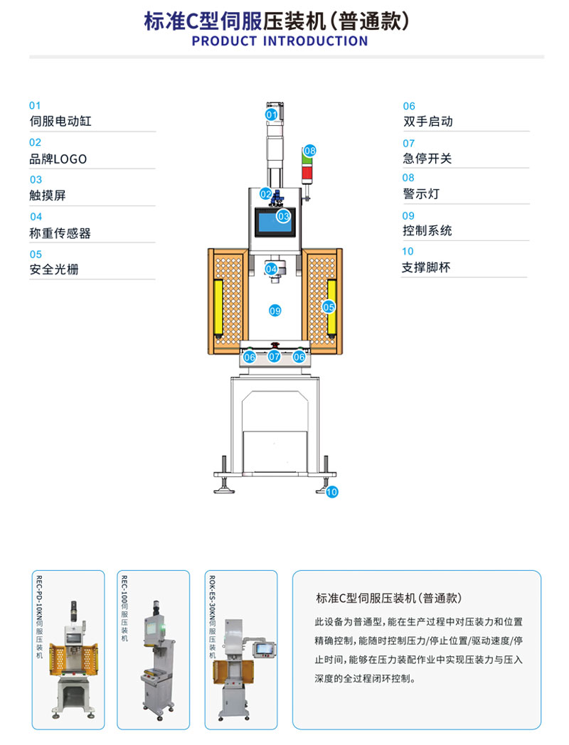三、安全精密:每台机器均安装红外线安全光栅,有效保护操作人员,伺服智能专利控制匹配最佳的压装方案,确保机器重复定位精度可达0.01mm,压力误差±1%。