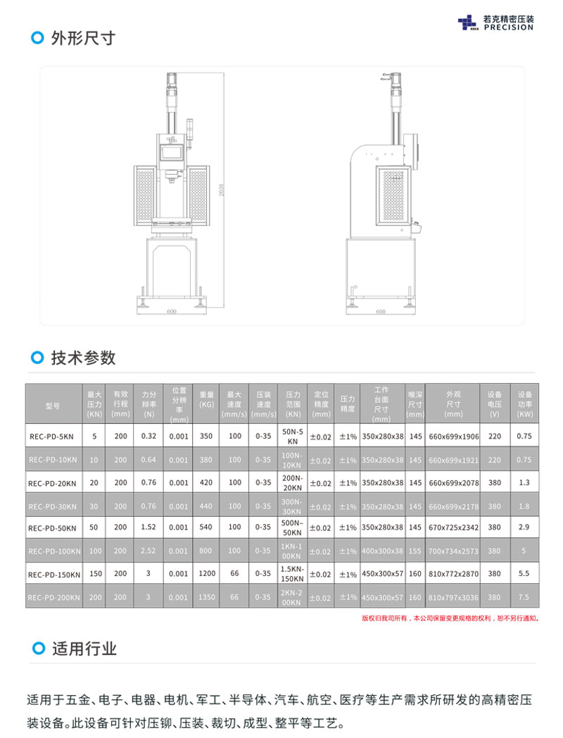 一、提高生产率: 行程长度可设定为生产必要的最小值,可维持与加工内容相适合的成形速度,现有若克主机通过千锤百炼的实验结论,合理定义为0.5T; 2.0T; 5T;10T四款机型,压力涵盖0.1-10T范围,满足精密压装组件的基本需求,如需定制,可做非标选型。