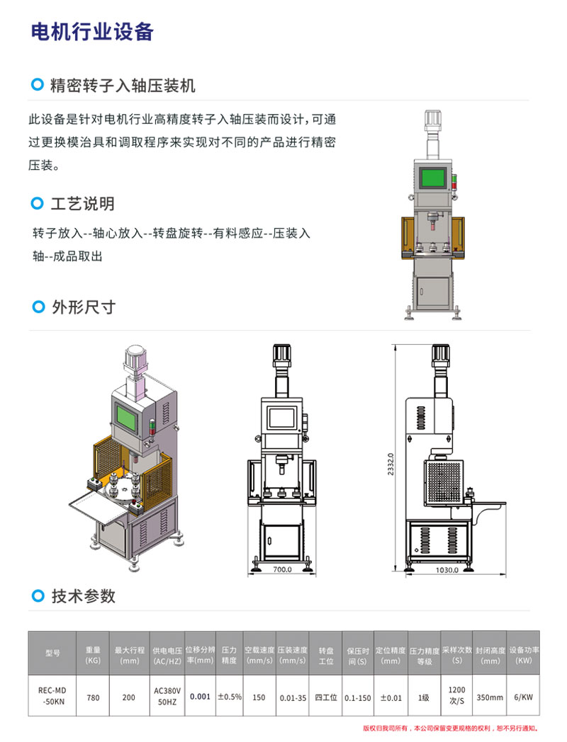 三、安全精密:每台机器均安装红外线安全光栅,有效保护操作人员,伺服智能专利控制匹配最佳的压装方案,确保机器重复定位精度可达0.01mm,压力误差±1%。