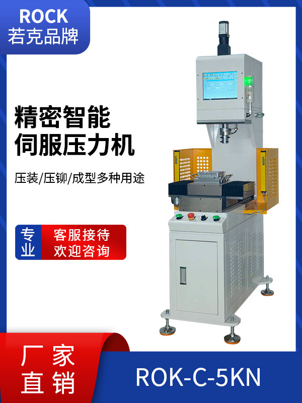 若克伺服压装机系统ROCK PRESS FITTING SYSTEM由主机、控制电脑、机架(选配)组成,结构紧凑,充满力的美感,在体验科技带来的便利之际,令压装工作成为轻松加愉快的享受。 主机:机型结构分为四柱、C型机(建议2T机型以上选用四柱机,更加稳定,行程更长。)