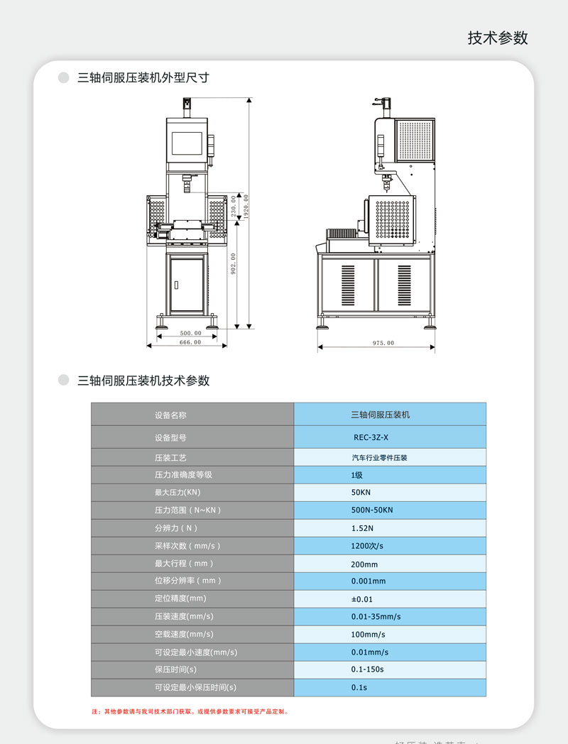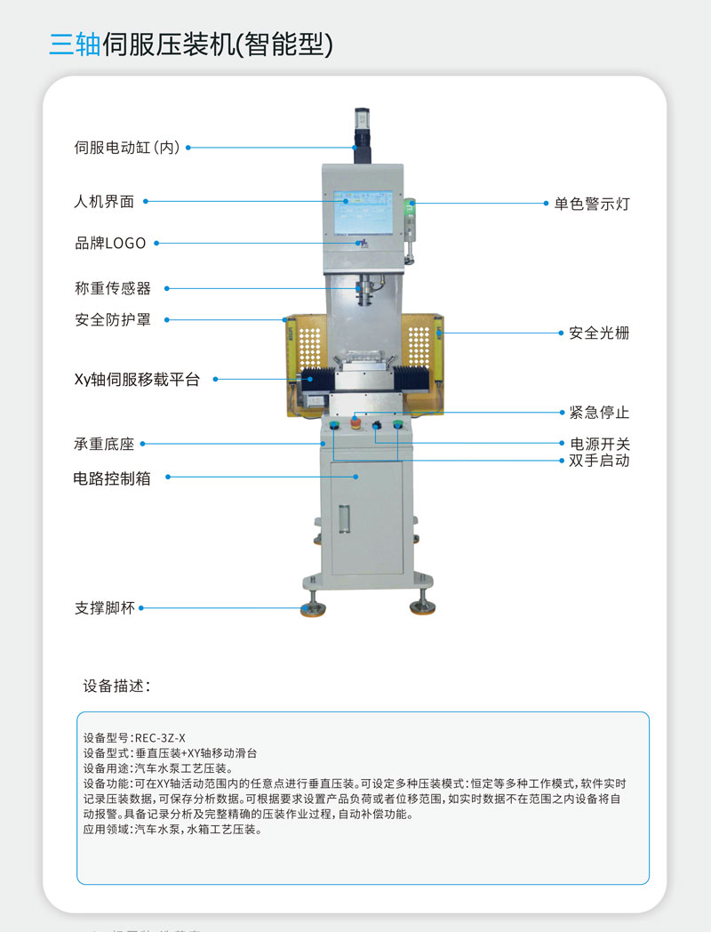 三、安全精密:每台机器均安装红外线安全光栅,有效保护操作人员,伺服智能专利控制匹配最佳的压装方案,确保机器重复定位精度可达0.01mm,压力误差±1%。
