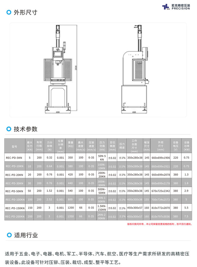 一、提高生产率: 行程长度可设定为生产必要的最小值,可维持与加工内容相适合的成形速度,现有若克主机通过千锤百炼的实验结论,合理定义为0.5T; 2.0T; 5T;10T四款机型,压力涵盖0.1-10T范围,满足精密压装组件的基本需求,如需定制,可做非标选型。