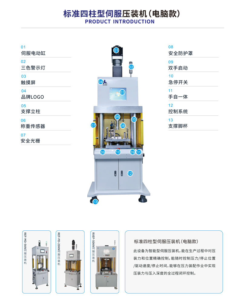 三、安全精密:每台机器均安装红外线安全光栅,有效保护操作人员,伺服智能专利控制匹配最佳的压装方案,确保机器重复定位精度可达0.01mm,压力误差±1%。