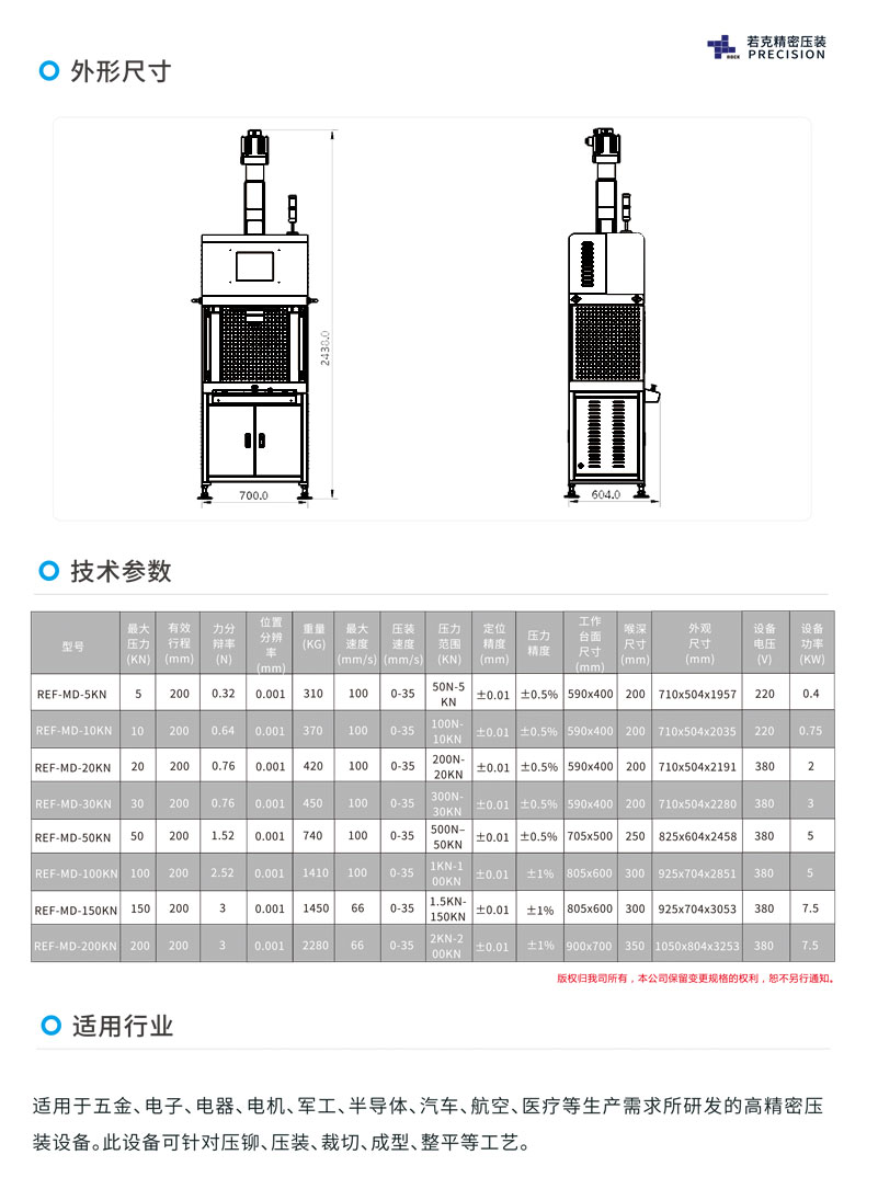 一、提高生产率: 行程长度可设定为生产必要的最小值,可维持与加工内容相适合的成形速度,现有若克主机通过千锤百炼的实验结论,合理定义为0.5T; 2.0T; 5T;10T四款机型,压力涵盖0.1-10T范围,满足精密压装组件的基本需求,如需定制,可做非标选型。